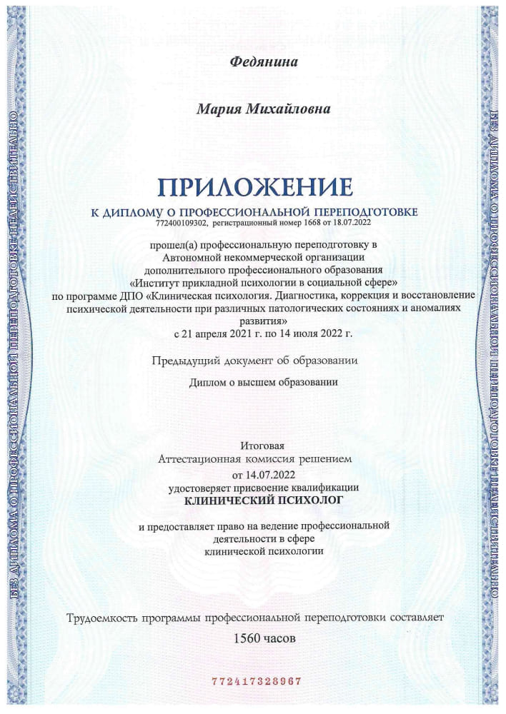 Очень благодарен Марии Михайловне Федяниной за поддержку и искреннее внимание. С ее помощью мне удалось преодолеть серьезные конфликты и преодолеть трудности, которые мешали жить. Мария Михайловна создала атмосферу доверия, где можно было открыться и начать работать над собой. Я чувствовал значительные изменения в своем самочувствии и настроении. Рекомендую этого замечательного специалиста всем, кто нуждается в профессиональной помощи!